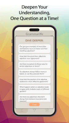 - Dive Deeper Functionality: Embark on a deeper investigation of intricate grammatical elements with the 'Dive Deeper' feature, stimulating further inquiry and mastery of the Italian language.
