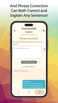 - Phrase Correction Capability: Improve your Italian writing with phrase correction that offers detailed corrections and in-depth explanations, enriching your knowledge and application of the language.